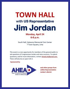 An energetic band of organizers has been working overtime to set up the Jim Jordan Town Hall, Monday, April 24, in Lima (see calendar for details). We’ve been told that this is the only town hall to be held by a Republican representative in Ohio in 2017. A core goal of the town hall is for Jordan’s constituents to get a chance to hear his answers directly. The organizing team is dedicated to creating a respectful, civil dialogue. We encourage everyone to come, even if you are not a Jordan constituent. It should be a great learning opportunity. And, spread the word. Here is the press release and a link to the poster featured on the left. We encourage people to submit questions and personal stories in advance: send to ahead.oh@gmail.com.