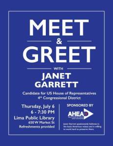 Members of the public are invited to attend an AHEAD-sponsored open forum featuring Janet Garrett, candidate for the U.S. House of Representatives from Congressional District 4. The event will be held tonight, Thursday, July 6, from 6:00-7:30 p.m. in the auditorium at the Lima Public Library at 650 W Market St.