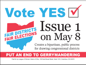 Vote yes on Issue 1 on May 8. Issue 1 will stop gerrymandering by creating a bipartisan, public process for drawing Congressional districts. Issue 1 is supported by the Ohio Democratic Party, the Ohio Republican party, and Fair Districts Fair Elections.