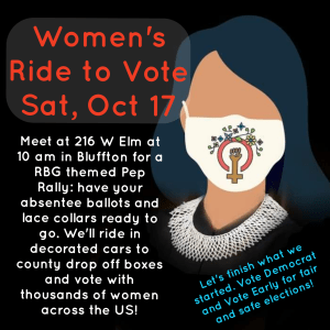 Bluffton, OH: On Saturday, October 17th, hundreds of women from Allen, Hardin, Hancock, and Putnam counties will gather outdoors at 10 AM at the Bluffton Democratic headquarters at 216 W Elm. This early voting pep rally for change in Washington has a lineup that includes lawyers, activists, youth and politicians.